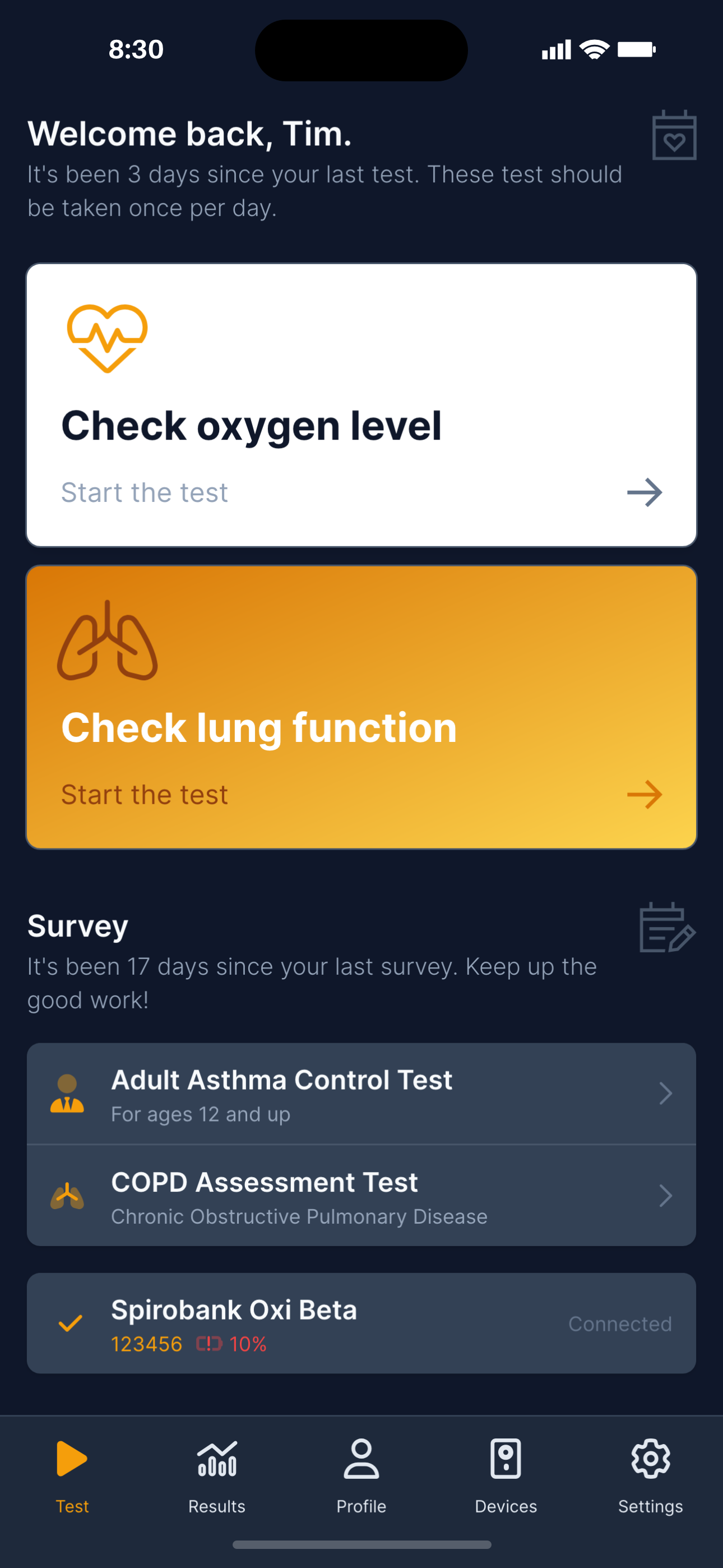 LungLink is an innovative mobile application designed for at-home respiratory testing, available on both iOS and Android platforms. This user-friendly app seamlessly connects with Bluetooth-enabled devices, enabling patients to independently perform Pulse Oximetry and FEVplus spirometry tests. The application guides users through each testing step with clear instructions and presents results in an easily understandable format.
